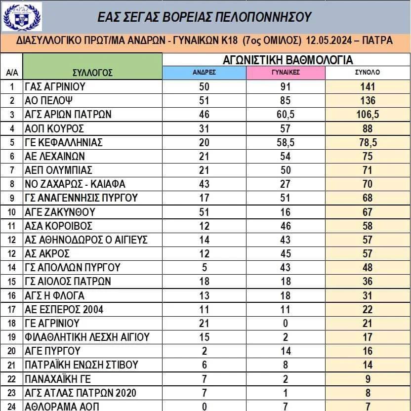 Ιδανικά για τον ΓΑΣ Αγρινίου ολοκληρώθηκαν τα Δια συλλογικά Πρωταθλήματα στίβου, αφού μετά την 2η θέση στο Διασυλλογικό Πρωτάθλημα Κ16 και την 3η στο αντίστοιχο Ανδρών – Γυναικών κι Κ20 κατέκτησε την 1η θέση στο Πρωτάθλημα Κ18.